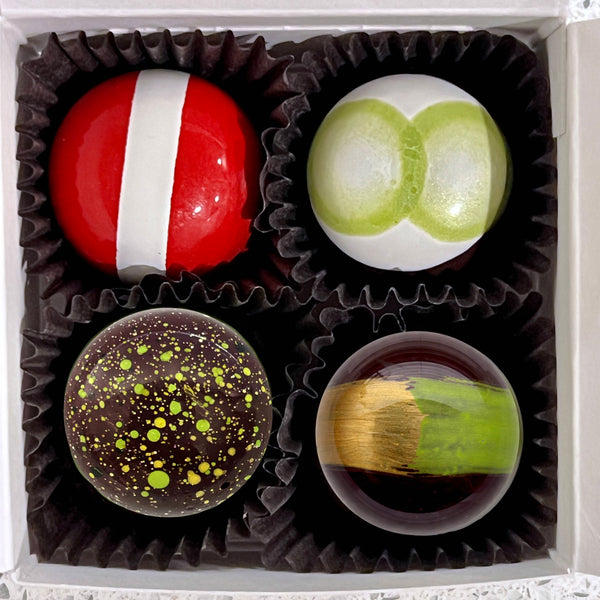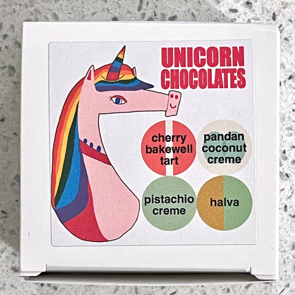 One each of 4 vegan chocolates in the following flavors: cherry bakewell tart, halva, pandan coconut creme, pistachio creme.