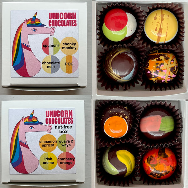 4-piece box (no nuts): One each of 4 vegan chocolates in the following flavors: cinnamon apricot, guava 2 ways, Irish creme, cranberry orange.
