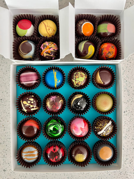 16-piece box: One each of 16 vegan chocolates in the following flavors: ube, blueberry lemon custard, caramel apple, rum raisin, banana pudding, bear lake raspberry shake, date & fennel, spiced pear, cherry almond crunch, butter mint, pink drink, yuzu coconut, fudge, lingonberry hazelnut, passion fruit banana, maple bar.